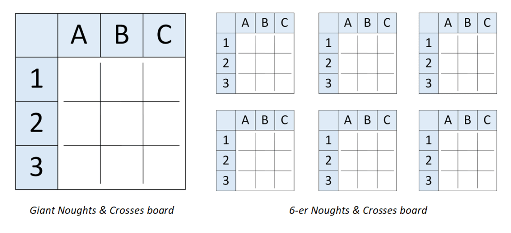 A game that’s stood the test of time! Also known as Tic-Tac-Toe, all you have to do is try and get three Xs or three Os in a row. The board has been adapted so you can easily tell the other player in which space you’re making your move.